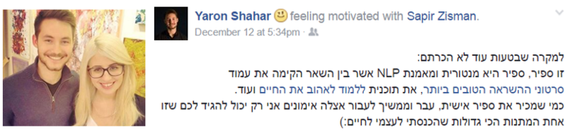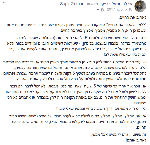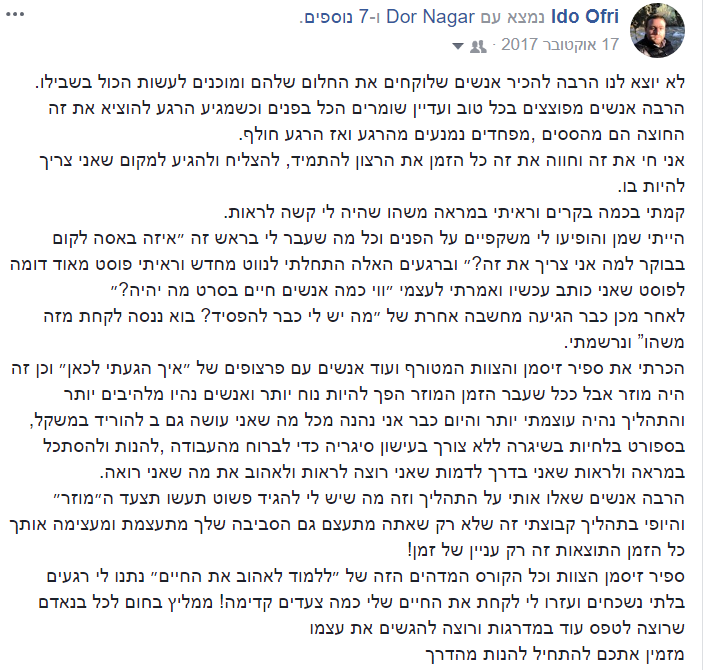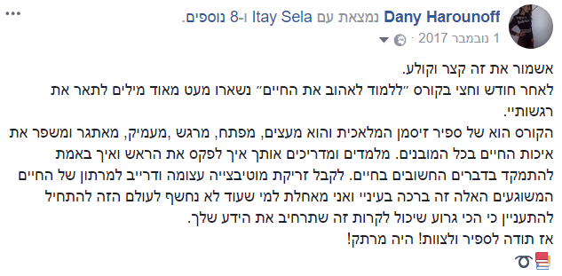 וגם בכלל פה הרגשתי שקיבלתי כלים פרקטיים יותר ליישום לחיים יותר טובים, לחשוב אחרת, להאמין אחרת, לשאוף יותר, לקדם את המטרות שלך, להיות אדם יותר טוב, לתת יותר לעולם"