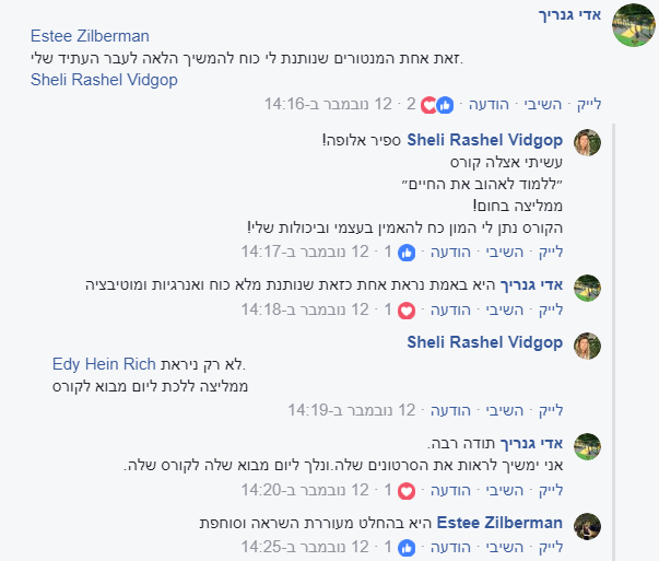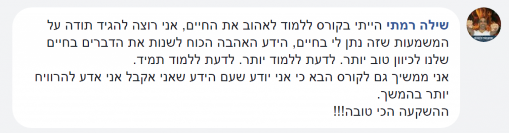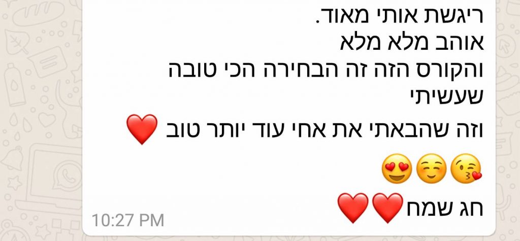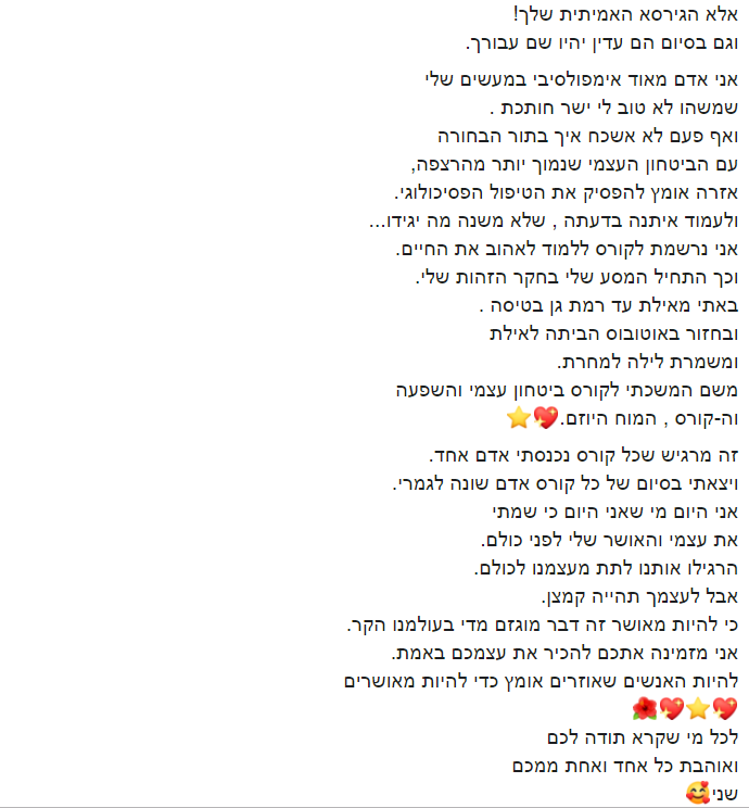 הקורס הזה נתן לי את הכוח להתמיד, להאמין בעצמי, לעמוד מול המראה ולהיות מסוגלת להגיד לעצמי שאני אוהבת אותי.