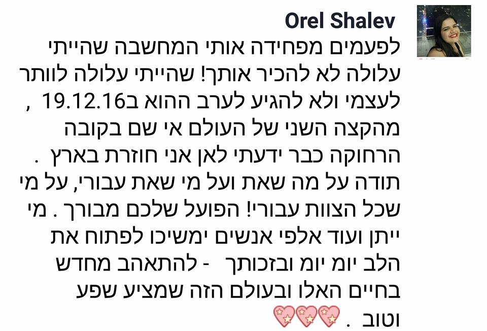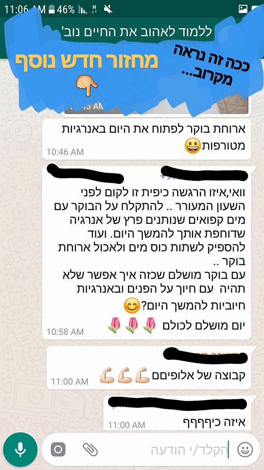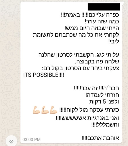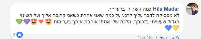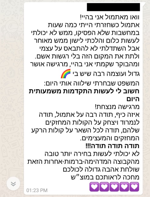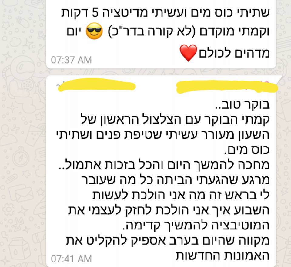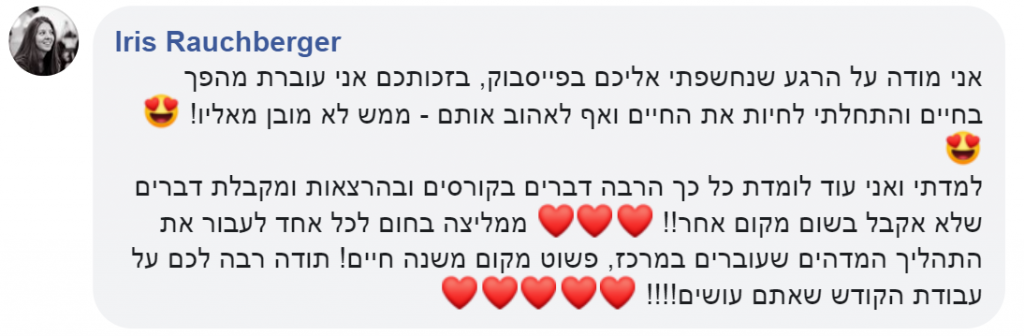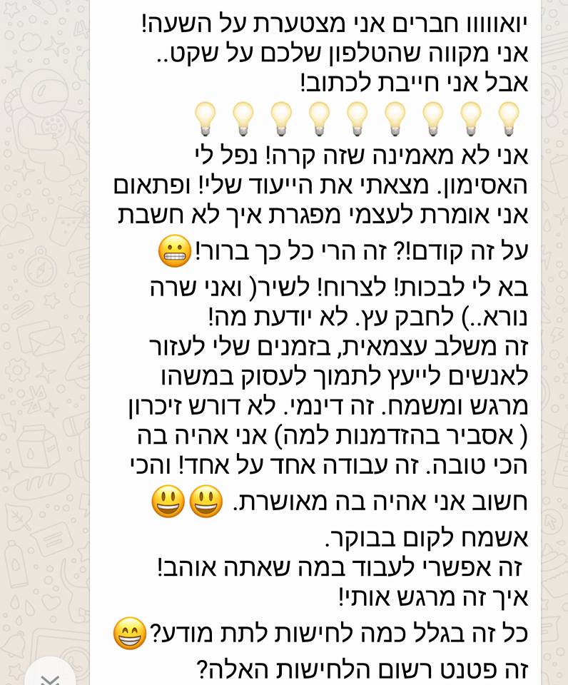 זה לא יאומן כמה שהתהליך הזה שינה לי את החיים – זה ממש ניקה ממני כל כך הרבה דברים, כל כך הרבה אמונות שהשאירו אותי במקום, כל כך הרבה דברים שעברתי ומטענים שסחבתי ולא ידעתי כמה שהם עוצרים אותי וזה פשוט החזיר אותי למישהי שהייתי לפני הרבה מאוד שנים – מישהי שבטוחה בעצמה, ורוצה להיות בחברת אנשים, מישהי שאוהבת את הכל בה, גם מבחינה חיצונית וגם מבחינה פנימית. מאמינה בכישורים שלה וביכולות שלה, ופתאום יש מוטיבציה וחשק לחיות ופתאום אני שמחה!