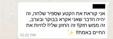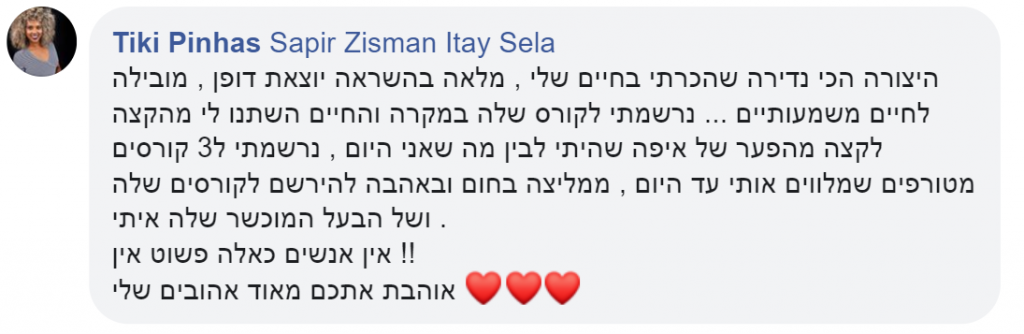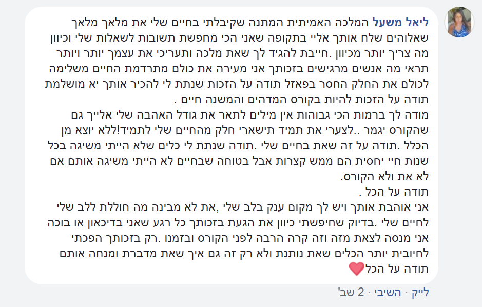 "למדתי המון בחיים שלי – תואר בפסיכולוגיה, עבודה בבריאות הנפש, קאוצ'ינג, אימון, מיסטיקה – כל מה שקשור לעולם ההתפתחות האישית ופה אני הרגשתי שאני קיבלתי כלים הרבה מעבר לכל מה שלמדתי גם בפסיכולוגיה
