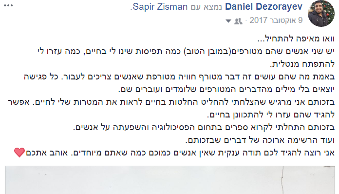 לא צריך – חייב! אז הגעתי לתהליך… בפחד, חסר ביטחון פתאום הרגשתי פתוח! הכרתי אנשים שהם כל העולם שלי היום הם הרשת ביטחון שלי.
