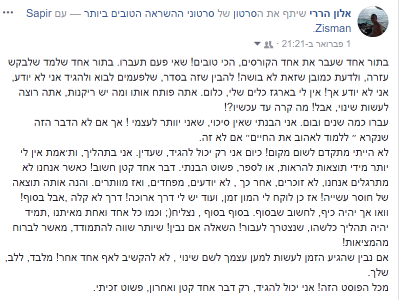 מאז שאני בסדנה התחלתי לקרוא ספרים, ליזום, הקמתי פרוייקט עם חבר, התחלתי להתאמן, ב6 שבועות קראתי 4 וחצי ספרים אחרי 27 שנה שלא קראתי