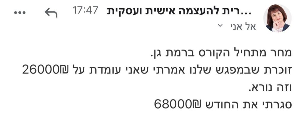 אם כואב לך לראות מתחרים פחות טובים ממך עושים יותר כסף ממך, ונמאס לך להרגיש לבד בעסק ושהכל על הכתפיים שלך, הלחץ האין סופי משגע אותך, נמאס לך להרגיש כל הזמן "שנייה לפני פיצוץ" ושהפיצוץ אף פעם לא מגיע – ואם ברור לך שמגיע לך להצליח ומגיע לך להרוויח ומגיע לך להרגיש סיפוק והגשמה – חובה עליך לקרוא את הדף הזה בריכוז ולשקול את מה שאני הולכת להציע לך: