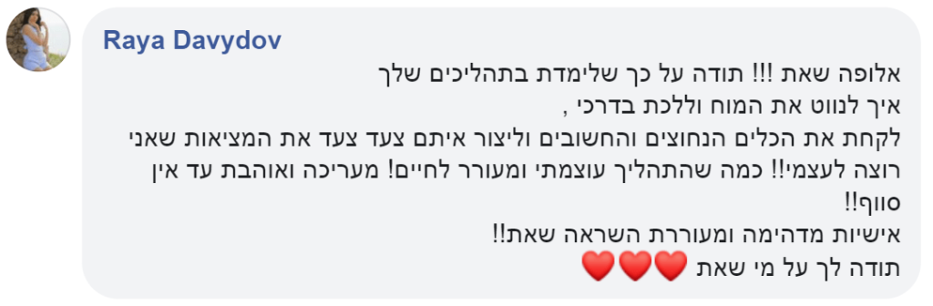 אם אתם כאן, כנראה שהבנתם שכדי לחיות חיים משמעותיים ולא למות עם חרטה, צריך לקבל החלטות חדשות ולרכוש ידע, מיומנויות ומיינדסט חדשים. אני מברכת אתכם, ברוכים הבאים למשפחה.