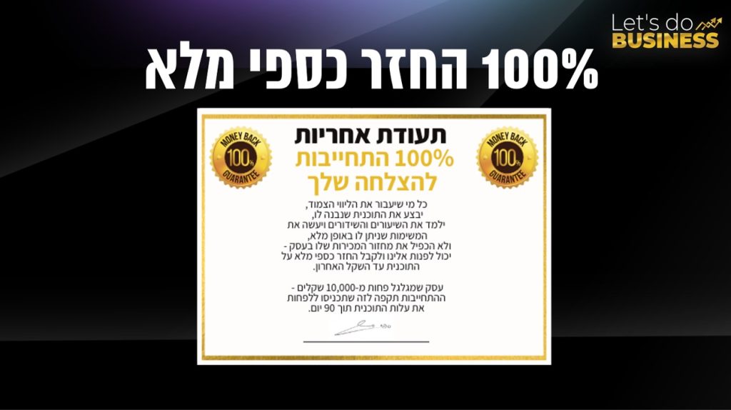 אבל אם זה לא מספיק הוספנו 100% אחריות לתוצאות, להכפיל את העסק ב-90 יום או לקבל החזר כספי מלא! אם בא לכם שהעסק יעזור לכם להגשים את עצמכם, שהעסק יוציא אתכם לחופש ויעבוד בשבילכם ולהפסיק להיות עבדים של העסק ושל העובדים שלכם, כל מה שצריך זה ללחוץ כאן ולהצטרף לתכנית המצליחה והרווחית ביותר לעסקים בישראל: